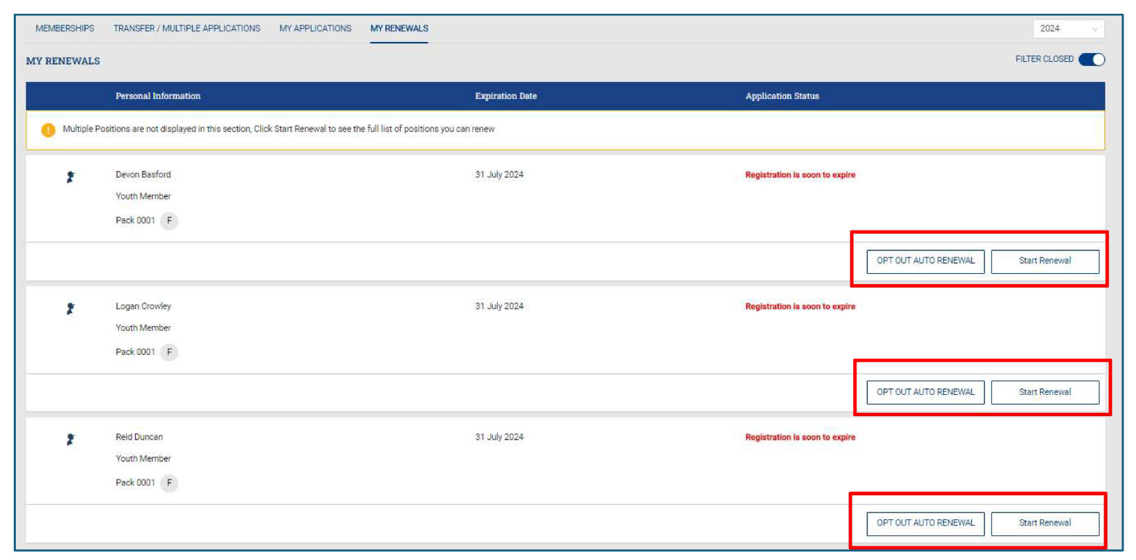 Select "Start Renewal" to proceed with the renewal. Renewals will be completed one at a time if
