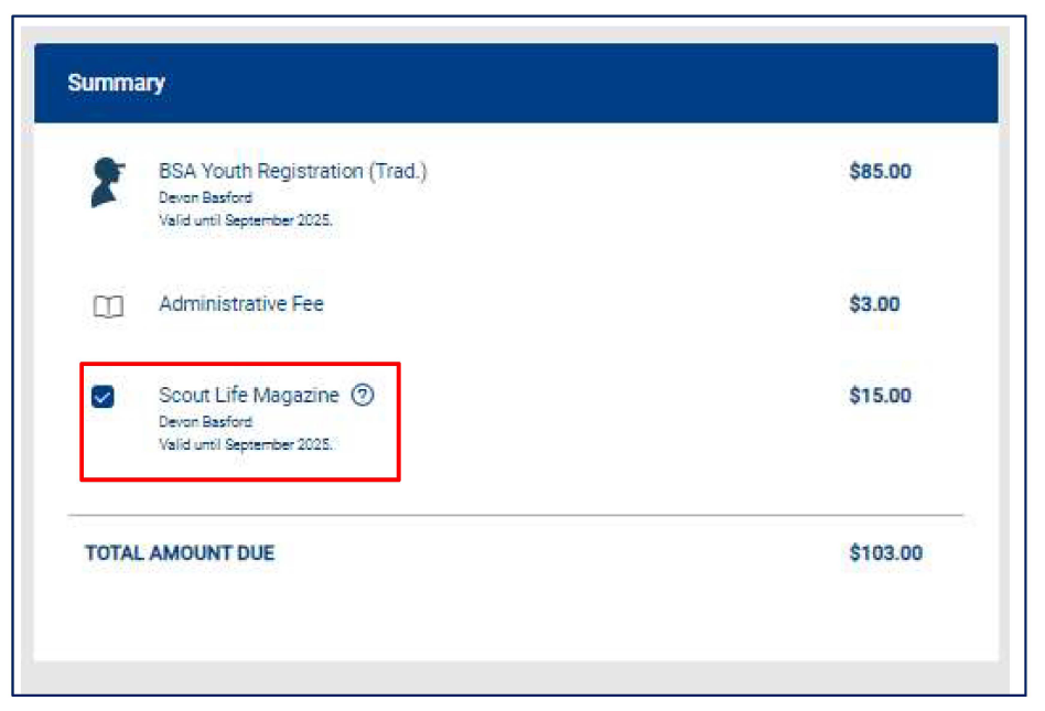 Review the summary of charges. Notice that Scout Life is selected by default. If you do not